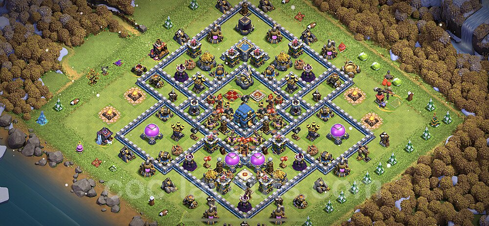 This Town Hall 12 farming base is optimized to protect your resources including Gold, Elixir, and Dark Elixir from raiders. The layout features centralized storages with multiple compartments that make it extremely difficult for attackers to steal large amounts of resources in a single raid. This design philosophy prioritizes resource protection over trophies, making it ideal for players focused on upgrading their village. The strategic placement of resource storages ensures they are well-protected by high-damage defenses like X-Bows, Inferno Towers, and Eagle Artillery. Each storage is surrounded by multiple wall layers and defensive structures, forcing attackers to invest heavily in troops and spells to reach your loot. The farming base design also incorporates strategic dead zones where attackers' troops tend to path inefficiently, wasting time and taking heavy damage from nearby defenses. Collectors and mines are positioned on the outer edges as "bait" while your main storages remain heavily protected in the core. This layout has proven effective against common farming strategies like BARCH (Barbarians + Archers), GoWiPe (Golems + Wizards + Pekka), and mass Miner attacks. The compartmentalized design prevents attackers from funneling straight to your resources, ensuring you maintain your hard-earned loot for important upgrades.
