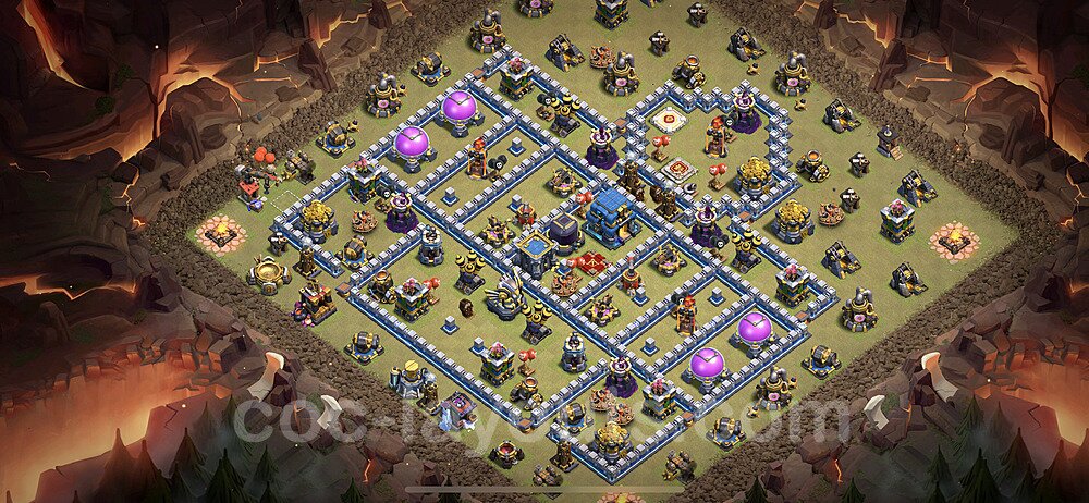 This Town Hall 12 war base is specifically designed to defend against 2-star and 3-star attacks in Clan Wars and Clan War Leagues. The strategic placement of defenses creates multiple compartments that force attackers to use more troops and spells than anticipated. Key defensive structures like Eagle Artillery, Inferno Towers, and X-Bows are positioned to cover crucial sections of the base, making it extremely difficult for opponents to secure a perfect attack. The core of this war base features a centralized Town Hall and Clan Castle, protected by multiple layers of walls and high-damage defenses. This layout forces attackers to commit significant resources just to reach the center, often leaving them without enough firepower to secure the Town Hall destruction. The anti-2-star design ensures that even if attackers breach the outer defenses, they'll struggle to achieve a 50% destruction rating. Air defenses are strategically spread to counter popular air attack strategies like LaLoon (Lava Hound + Balloons) and Electrone (Electro Dragons + Stone Slammer). The symmetrical trap placement and strategic Hidden Tesla positions create deadly surprise elements that can completely derail an attacker's plan. This base has been tested against various meta attack strategies and has consistently proven effective in preventing 3-star attacks.