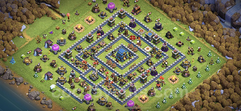 This Town Hall 12 war base is specifically designed to defend against 2-star and 3-star attacks in Clan Wars and Clan War Leagues. The strategic placement of defenses creates multiple compartments that force attackers to use more troops and spells than anticipated. Key defensive structures like Eagle Artillery, Inferno Towers, and X-Bows are positioned to cover crucial sections of the base, making it extremely difficult for opponents to secure a perfect attack. The core of this war base features a centralized Town Hall and Clan Castle, protected by multiple layers of walls and high-damage defenses. This layout forces attackers to commit significant resources just to reach the center, often leaving them without enough firepower to secure the Town Hall destruction. The anti-2-star design ensures that even if attackers breach the outer defenses, they'll struggle to achieve a 50% destruction rating. Air defenses are strategically spread to counter popular air attack strategies like LaLoon (Lava Hound + Balloons) and Electrone (Electro Dragons + Stone Slammer). The symmetrical trap placement and strategic Hidden Tesla positions create deadly surprise elements that can completely derail an attacker's plan. This base has been tested against various meta attack strategies and has consistently proven effective in preventing 3-star attacks.