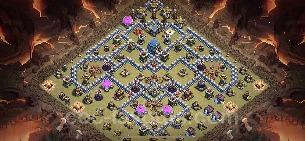 This Town Hall 12 hybrid base offers the best of both worlds - strong resource protection combined with effective trophy defense. The versatile design makes it an excellent choice for players who want to protect their loot while maintaining their trophy count. This balanced approach ensures you don't sacrifice one aspect of defense for another, making it ideal for active players across all league levels. The hybrid layout features centralized resource storages alongside a well-protected Town Hall, with multiple defensive layers that deter both farming raids and trophy pushers. High-value targets are strategically positioned within overlapping defense ranges, forcing attackers to make difficult choices about which objectives to prioritize. The compartmentalized design prevents attackers from easily achieving both loot destruction and the Town Hall kill in a single attack. Defense placement in this hybrid base creates strong coverage against both ground and air attacks. Inferno Towers, X-Bows, and Eagle Artillery work in concert to eliminate threats quickly, while splash damage defenses like Wizard Towers and Bomb Towers counter swarm strategies. The base's funnel-resistant design and strategic trap placement make it effective against popular attack strategies including QC LaLoon (Queen Charge Lava Hound Balloon), Blizzard attacks, and Yeti Smash compositions.