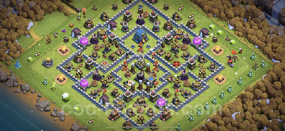 This Town Hall 12 hybrid base offers the best of both worlds - strong resource protection combined with effective trophy defense. The versatile design makes it an excellent choice for players who want to protect their loot while maintaining their trophy count. This balanced approach ensures you don't sacrifice one aspect of defense for another, making it ideal for active players across all league levels. The hybrid layout features centralized resource storages alongside a well-protected Town Hall, with multiple defensive layers that deter both farming raids and trophy pushers. High-value targets are strategically positioned within overlapping defense ranges, forcing attackers to make difficult choices about which objectives to prioritize. The compartmentalized design prevents attackers from easily achieving both loot destruction and the Town Hall kill in a single attack. Defense placement in this hybrid base creates strong coverage against both ground and air attacks. Inferno Towers, X-Bows, and Eagle Artillery work in concert to eliminate threats quickly, while splash damage defenses like Wizard Towers and Bomb Towers counter swarm strategies. The base's funnel-resistant design and strategic trap placement make it effective against popular attack strategies including QC LaLoon (Queen Charge Lava Hound Balloon), Blizzard attacks, and Yeti Smash compositions.