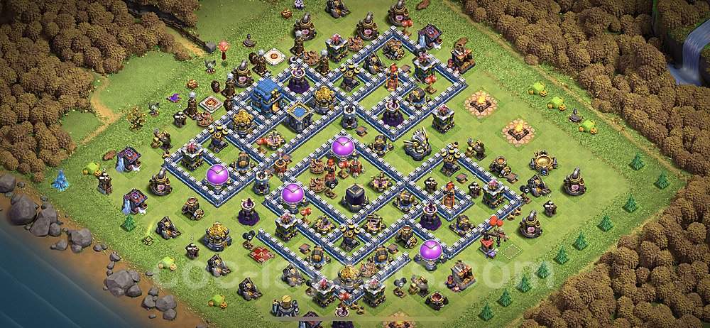 This Town Hall 12 hybrid base offers the best of both worlds - strong resource protection combined with effective trophy defense. The versatile design makes it an excellent choice for players who want to protect their loot while maintaining their trophy count. This balanced approach ensures you don't sacrifice one aspect of defense for another, making it ideal for active players across all league levels. The hybrid layout features centralized resource storages alongside a well-protected Town Hall, with multiple defensive layers that deter both farming raids and trophy pushers. High-value targets are strategically positioned within overlapping defense ranges, forcing attackers to make difficult choices about which objectives to prioritize. The compartmentalized design prevents attackers from easily achieving both loot destruction and the Town Hall kill in a single attack. Defense placement in this hybrid base creates strong coverage against both ground and air attacks. Inferno Towers, X-Bows, and Eagle Artillery work in concert to eliminate threats quickly, while splash damage defenses like Wizard Towers and Bomb Towers counter swarm strategies. The base's funnel-resistant design and strategic trap placement make it effective against popular attack strategies including QC LaLoon (Queen Charge Lava Hound Balloon), Blizzard attacks, and Yeti Smash compositions.