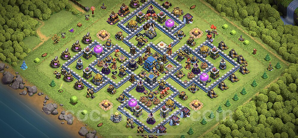 This Town Hall 12 hybrid base offers the best of both worlds - strong resource protection combined with effective trophy defense. The versatile design makes it an excellent choice for players who want to protect their loot while maintaining their trophy count. This balanced approach ensures you don't sacrifice one aspect of defense for another, making it ideal for active players across all league levels. The hybrid layout features centralized resource storages alongside a well-protected Town Hall, with multiple defensive layers that deter both farming raids and trophy pushers. High-value targets are strategically positioned within overlapping defense ranges, forcing attackers to make difficult choices about which objectives to prioritize. The compartmentalized design prevents attackers from easily achieving both loot destruction and the Town Hall kill in a single attack. Defense placement in this hybrid base creates strong coverage against both ground and air attacks. Inferno Towers, X-Bows, and Eagle Artillery work in concert to eliminate threats quickly, while splash damage defenses like Wizard Towers and Bomb Towers counter swarm strategies. The base's funnel-resistant design and strategic trap placement make it effective against popular attack strategies including QC LaLoon (Queen Charge Lava Hound Balloon), Blizzard attacks, and Yeti Smash compositions.