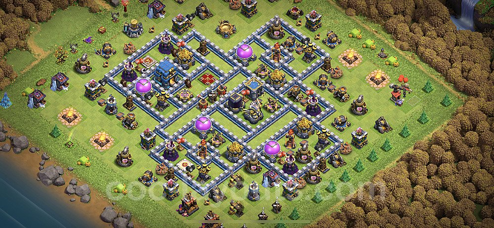 This Town Hall 12 hybrid base offers the best of both worlds - strong resource protection combined with effective trophy defense. The versatile design makes it an excellent choice for players who want to protect their loot while maintaining their trophy count. This balanced approach ensures you don't sacrifice one aspect of defense for another, making it ideal for active players across all league levels. The hybrid layout features centralized resource storages alongside a well-protected Town Hall, with multiple defensive layers that deter both farming raids and trophy pushers. High-value targets are strategically positioned within overlapping defense ranges, forcing attackers to make difficult choices about which objectives to prioritize. The compartmentalized design prevents attackers from easily achieving both loot destruction and the Town Hall kill in a single attack. Defense placement in this hybrid base creates strong coverage against both ground and air attacks. Inferno Towers, X-Bows, and Eagle Artillery work in concert to eliminate threats quickly, while splash damage defenses like Wizard Towers and Bomb Towers counter swarm strategies. The base's funnel-resistant design and strategic trap placement make it effective against popular attack strategies including QC LaLoon (Queen Charge Lava Hound Balloon), Blizzard attacks, and Yeti Smash compositions.