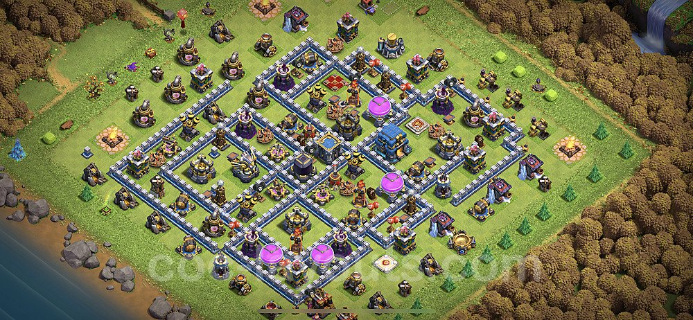 This Town Hall 12 hybrid base offers the best of both worlds - strong resource protection combined with effective trophy defense. The versatile design makes it an excellent choice for players who want to protect their loot while maintaining their trophy count. This balanced approach ensures you don't sacrifice one aspect of defense for another, making it ideal for active players across all league levels. The hybrid layout features centralized resource storages alongside a well-protected Town Hall, with multiple defensive layers that deter both farming raids and trophy pushers. High-value targets are strategically positioned within overlapping defense ranges, forcing attackers to make difficult choices about which objectives to prioritize. The compartmentalized design prevents attackers from easily achieving both loot destruction and the Town Hall kill in a single attack. Defense placement in this hybrid base creates strong coverage against both ground and air attacks. Inferno Towers, X-Bows, and Eagle Artillery work in concert to eliminate threats quickly, while splash damage defenses like Wizard Towers and Bomb Towers counter swarm strategies. The base's funnel-resistant design and strategic trap placement make it effective against popular attack strategies including QC LaLoon (Queen Charge Lava Hound Balloon), Blizzard attacks, and Yeti Smash compositions.