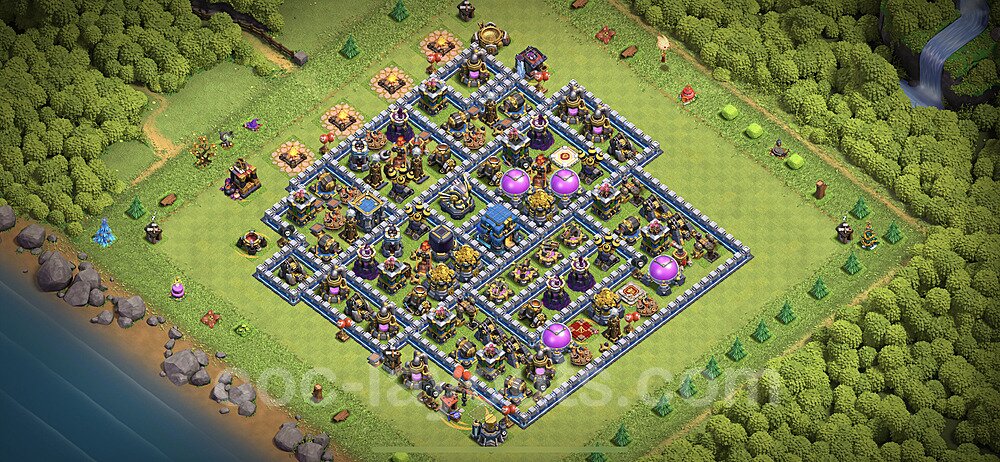 This Town Hall 12 hybrid base offers the best of both worlds - strong resource protection combined with effective trophy defense. The versatile design makes it an excellent choice for players who want to protect their loot while maintaining their trophy count. This balanced approach ensures you don't sacrifice one aspect of defense for another, making it ideal for active players across all league levels. The hybrid layout features centralized resource storages alongside a well-protected Town Hall, with multiple defensive layers that deter both farming raids and trophy pushers. High-value targets are strategically positioned within overlapping defense ranges, forcing attackers to make difficult choices about which objectives to prioritize. The compartmentalized design prevents attackers from easily achieving both loot destruction and the Town Hall kill in a single attack. Defense placement in this hybrid base creates strong coverage against both ground and air attacks. Inferno Towers, X-Bows, and Eagle Artillery work in concert to eliminate threats quickly, while splash damage defenses like Wizard Towers and Bomb Towers counter swarm strategies. The base's funnel-resistant design and strategic trap placement make it effective against popular attack strategies including QC LaLoon (Queen Charge Lava Hound Balloon), Blizzard attacks, and Yeti Smash compositions.