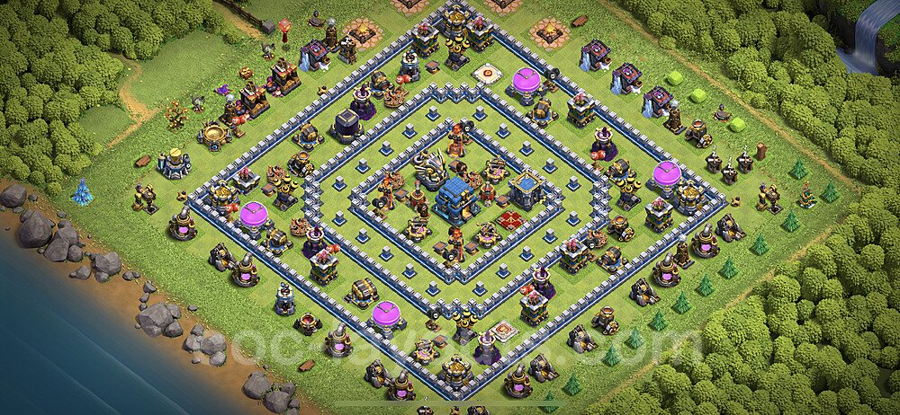 This Town Hall 12 hybrid base offers the best of both worlds - strong resource protection combined with effective trophy defense. The versatile design makes it an excellent choice for players who want to protect their loot while maintaining their trophy count. This balanced approach ensures you don't sacrifice one aspect of defense for another, making it ideal for active players across all league levels. The hybrid layout features centralized resource storages alongside a well-protected Town Hall, with multiple defensive layers that deter both farming raids and trophy pushers. High-value targets are strategically positioned within overlapping defense ranges, forcing attackers to make difficult choices about which objectives to prioritize. The compartmentalized design prevents attackers from easily achieving both loot destruction and the Town Hall kill in a single attack. Defense placement in this hybrid base creates strong coverage against both ground and air attacks. Inferno Towers, X-Bows, and Eagle Artillery work in concert to eliminate threats quickly, while splash damage defenses like Wizard Towers and Bomb Towers counter swarm strategies. The base's funnel-resistant design and strategic trap placement make it effective against popular attack strategies including QC LaLoon (Queen Charge Lava Hound Balloon), Blizzard attacks, and Yeti Smash compositions.