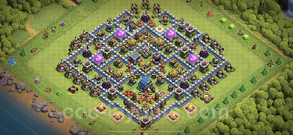This Town Hall 12 hybrid base offers the best of both worlds - strong resource protection combined with effective trophy defense. The versatile design makes it an excellent choice for players who want to protect their loot while maintaining their trophy count. This balanced approach ensures you don't sacrifice one aspect of defense for another, making it ideal for active players across all league levels. The hybrid layout features centralized resource storages alongside a well-protected Town Hall, with multiple defensive layers that deter both farming raids and trophy pushers. High-value targets are strategically positioned within overlapping defense ranges, forcing attackers to make difficult choices about which objectives to prioritize. The compartmentalized design prevents attackers from easily achieving both loot destruction and the Town Hall kill in a single attack. Defense placement in this hybrid base creates strong coverage against both ground and air attacks. Inferno Towers, X-Bows, and Eagle Artillery work in concert to eliminate threats quickly, while splash damage defenses like Wizard Towers and Bomb Towers counter swarm strategies. The base's funnel-resistant design and strategic trap placement make it effective against popular attack strategies including QC LaLoon (Queen Charge Lava Hound Balloon), Blizzard attacks, and Yeti Smash compositions.