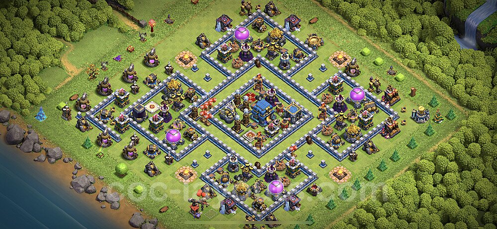 This Town Hall 12 war base is specifically designed to defend against 2-star and 3-star attacks in Clan Wars and Clan War Leagues. The strategic placement of defenses creates multiple compartments that force attackers to use more troops and spells than anticipated. Key defensive structures like Eagle Artillery, Inferno Towers, and X-Bows are positioned to cover crucial sections of the base, making it extremely difficult for opponents to secure a perfect attack. The core of this war base features a centralized Town Hall and Clan Castle, protected by multiple layers of walls and high-damage defenses. This layout forces attackers to commit significant resources just to reach the center, often leaving them without enough firepower to secure the Town Hall destruction. The anti-2-star design ensures that even if attackers breach the outer defenses, they'll struggle to achieve a 50% destruction rating. Air defenses are strategically spread to counter popular air attack strategies like LaLoon (Lava Hound + Balloons) and Electrone (Electro Dragons + Stone Slammer). The symmetrical trap placement and strategic Hidden Tesla positions create deadly surprise elements that can completely derail an attacker's plan. This base has been tested against various meta attack strategies and has consistently proven effective in preventing 3-star attacks.