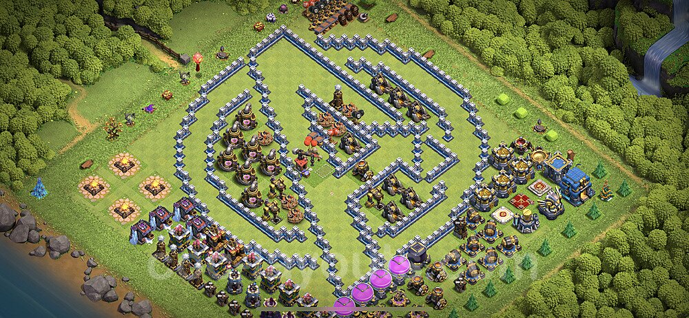 This Town Hall 12 war base is specifically designed to defend against 2-star and 3-star attacks in Clan Wars and Clan War Leagues. The strategic placement of defenses creates multiple compartments that force attackers to use more troops and spells than anticipated. Key defensive structures like Eagle Artillery, Inferno Towers, and X-Bows are positioned to cover crucial sections of the base, making it extremely difficult for opponents to secure a perfect attack. The core of this war base features a centralized Town Hall and Clan Castle, protected by multiple layers of walls and high-damage defenses. This layout forces attackers to commit significant resources just to reach the center, often leaving them without enough firepower to secure the Town Hall destruction. The anti-2-star design ensures that even if attackers breach the outer defenses, they'll struggle to achieve a 50% destruction rating. Air defenses are strategically spread to counter popular air attack strategies like LaLoon (Lava Hound + Balloons) and Electrone (Electro Dragons + Stone Slammer). The symmetrical trap placement and strategic Hidden Tesla positions create deadly surprise elements that can completely derail an attacker's plan. This base has been tested against various meta attack strategies and has consistently proven effective in preventing 3-star attacks.