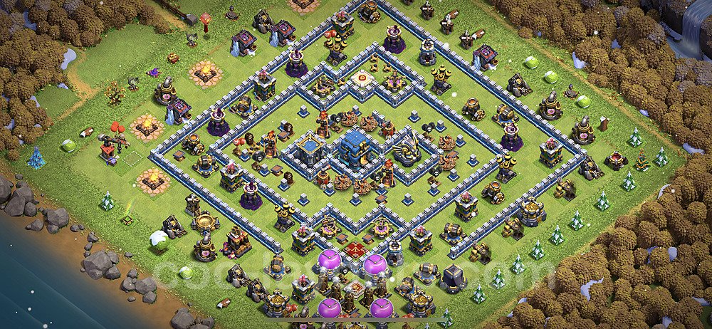This Town Hall 12 war base is specifically designed to defend against 2-star and 3-star attacks in Clan Wars and Clan War Leagues. The strategic placement of defenses creates multiple compartments that force attackers to use more troops and spells than anticipated. Key defensive structures like Eagle Artillery, Inferno Towers, and X-Bows are positioned to cover crucial sections of the base, making it extremely difficult for opponents to secure a perfect attack. The core of this war base features a centralized Town Hall and Clan Castle, protected by multiple layers of walls and high-damage defenses. This layout forces attackers to commit significant resources just to reach the center, often leaving them without enough firepower to secure the Town Hall destruction. The anti-2-star design ensures that even if attackers breach the outer defenses, they'll struggle to achieve a 50% destruction rating. Air defenses are strategically spread to counter popular air attack strategies like LaLoon (Lava Hound + Balloons) and Electrone (Electro Dragons + Stone Slammer). The symmetrical trap placement and strategic Hidden Tesla positions create deadly surprise elements that can completely derail an attacker's plan. This base has been tested against various meta attack strategies and has consistently proven effective in preventing 3-star attacks.