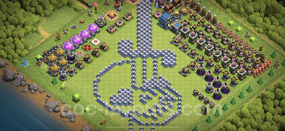 This Town Hall 12 war base is specifically designed to defend against 2-star and 3-star attacks in Clan Wars and Clan War Leagues. The strategic placement of defenses creates multiple compartments that force attackers to use more troops and spells than anticipated. Key defensive structures like Eagle Artillery, Inferno Towers, and X-Bows are positioned to cover crucial sections of the base, making it extremely difficult for opponents to secure a perfect attack. The core of this war base features a centralized Town Hall and Clan Castle, protected by multiple layers of walls and high-damage defenses. This layout forces attackers to commit significant resources just to reach the center, often leaving them without enough firepower to secure the Town Hall destruction. The anti-2-star design ensures that even if attackers breach the outer defenses, they'll struggle to achieve a 50% destruction rating. Air defenses are strategically spread to counter popular air attack strategies like LaLoon (Lava Hound + Balloons) and Electrone (Electro Dragons + Stone Slammer). The symmetrical trap placement and strategic Hidden Tesla positions create deadly surprise elements that can completely derail an attacker's plan. This base has been tested against various meta attack strategies and has consistently proven effective in preventing 3-star attacks.