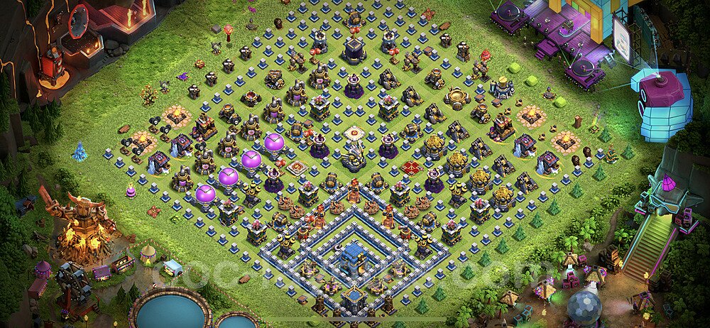 This Town Hall 12 war base is specifically designed to defend against 2-star and 3-star attacks in Clan Wars and Clan War Leagues. The strategic placement of defenses creates multiple compartments that force attackers to use more troops and spells than anticipated. Key defensive structures like Eagle Artillery, Inferno Towers, and X-Bows are positioned to cover crucial sections of the base, making it extremely difficult for opponents to secure a perfect attack. The core of this war base features a centralized Town Hall and Clan Castle, protected by multiple layers of walls and high-damage defenses. This layout forces attackers to commit significant resources just to reach the center, often leaving them without enough firepower to secure the Town Hall destruction. The anti-2-star design ensures that even if attackers breach the outer defenses, they'll struggle to achieve a 50% destruction rating. Air defenses are strategically spread to counter popular air attack strategies like LaLoon (Lava Hound + Balloons) and Electrone (Electro Dragons + Stone Slammer). The symmetrical trap placement and strategic Hidden Tesla positions create deadly surprise elements that can completely derail an attacker's plan. This base has been tested against various meta attack strategies and has consistently proven effective in preventing 3-star attacks.