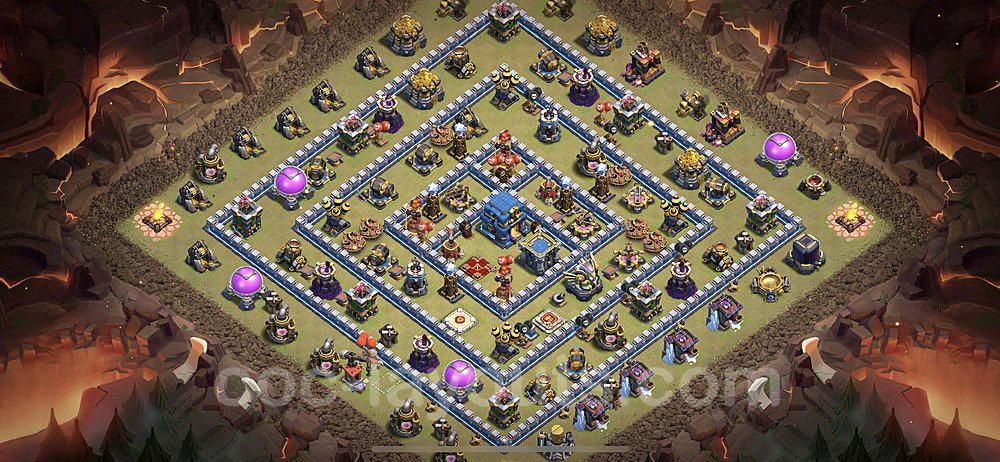 This Town Hall 12 war base is specifically designed to defend against 2-star and 3-star attacks in Clan Wars and Clan War Leagues. The strategic placement of defenses creates multiple compartments that force attackers to use more troops and spells than anticipated. Key defensive structures like Eagle Artillery, Inferno Towers, and X-Bows are positioned to cover crucial sections of the base, making it extremely difficult for opponents to secure a perfect attack. The core of this war base features a centralized Town Hall and Clan Castle, protected by multiple layers of walls and high-damage defenses. This layout forces attackers to commit significant resources just to reach the center, often leaving them without enough firepower to secure the Town Hall destruction. The anti-2-star design ensures that even if attackers breach the outer defenses, they'll struggle to achieve a 50% destruction rating. Air defenses are strategically spread to counter popular air attack strategies like LaLoon (Lava Hound + Balloons) and Electrone (Electro Dragons + Stone Slammer). The symmetrical trap placement and strategic Hidden Tesla positions create deadly surprise elements that can completely derail an attacker's plan. This base has been tested against various meta attack strategies and has consistently proven effective in preventing 3-star attacks.