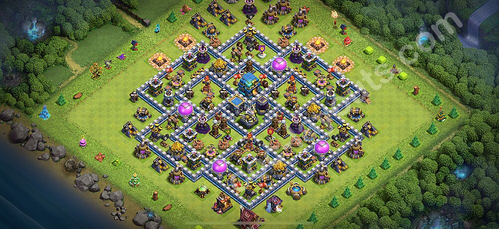 This Town Hall 12 war base is specifically designed to defend against 2-star and 3-star attacks in Clan Wars and Clan War Leagues. The strategic placement of defenses creates multiple compartments that force attackers to use more troops and spells than anticipated. Key defensive structures like Eagle Artillery, Inferno Towers, and X-Bows are positioned to cover crucial sections of the base, making it extremely difficult for opponents to secure a perfect attack. The core of this war base features a centralized Town Hall and Clan Castle, protected by multiple layers of walls and high-damage defenses. This layout forces attackers to commit significant resources just to reach the center, often leaving them without enough firepower to secure the Town Hall destruction. The anti-2-star design ensures that even if attackers breach the outer defenses, they'll struggle to achieve a 50% destruction rating. Air defenses are strategically spread to counter popular air attack strategies like LaLoon (Lava Hound + Balloons) and Electrone (Electro Dragons + Stone Slammer). The symmetrical trap placement and strategic Hidden Tesla positions create deadly surprise elements that can completely derail an attacker's plan. This base has been tested against various meta attack strategies and has consistently proven effective in preventing 3-star attacks.