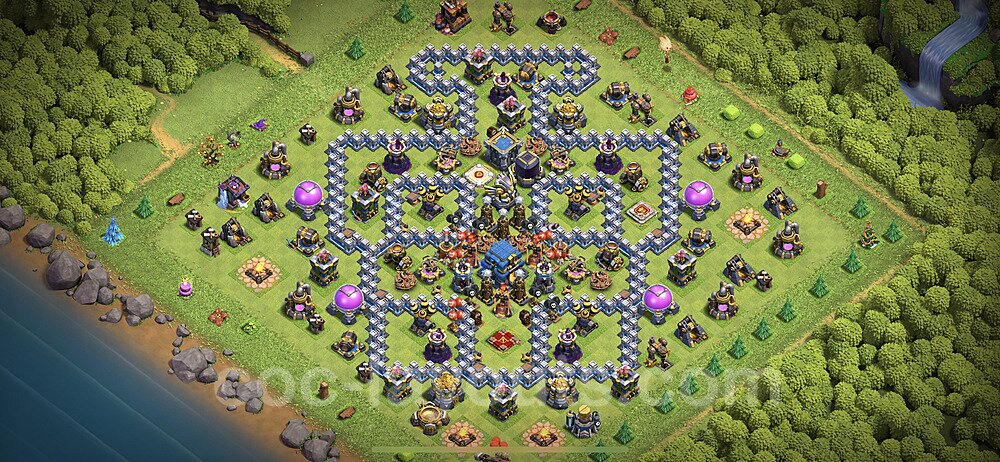 This Town Hall 12 war base is specifically designed to defend against 2-star and 3-star attacks in Clan Wars and Clan War Leagues. The strategic placement of defenses creates multiple compartments that force attackers to use more troops and spells than anticipated. Key defensive structures like Eagle Artillery, Inferno Towers, and X-Bows are positioned to cover crucial sections of the base, making it extremely difficult for opponents to secure a perfect attack. The core of this war base features a centralized Town Hall and Clan Castle, protected by multiple layers of walls and high-damage defenses. This layout forces attackers to commit significant resources just to reach the center, often leaving them without enough firepower to secure the Town Hall destruction. The anti-2-star design ensures that even if attackers breach the outer defenses, they'll struggle to achieve a 50% destruction rating. Air defenses are strategically spread to counter popular air attack strategies like LaLoon (Lava Hound + Balloons) and Electrone (Electro Dragons + Stone Slammer). The symmetrical trap placement and strategic Hidden Tesla positions create deadly surprise elements that can completely derail an attacker's plan. This base has been tested against various meta attack strategies and has consistently proven effective in preventing 3-star attacks.