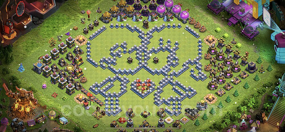 This Town Hall 12 war base is specifically designed to defend against 2-star and 3-star attacks in Clan Wars and Clan War Leagues. The strategic placement of defenses creates multiple compartments that force attackers to use more troops and spells than anticipated. Key defensive structures like Eagle Artillery, Inferno Towers, and X-Bows are positioned to cover crucial sections of the base, making it extremely difficult for opponents to secure a perfect attack. The core of this war base features a centralized Town Hall and Clan Castle, protected by multiple layers of walls and high-damage defenses. This layout forces attackers to commit significant resources just to reach the center, often leaving them without enough firepower to secure the Town Hall destruction. The anti-2-star design ensures that even if attackers breach the outer defenses, they'll struggle to achieve a 50% destruction rating. Air defenses are strategically spread to counter popular air attack strategies like LaLoon (Lava Hound + Balloons) and Electrone (Electro Dragons + Stone Slammer). The symmetrical trap placement and strategic Hidden Tesla positions create deadly surprise elements that can completely derail an attacker's plan. This base has been tested against various meta attack strategies and has consistently proven effective in preventing 3-star attacks.