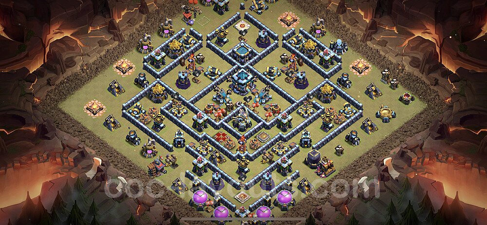 This Town Hall 13 war base is specifically designed to defend against 2-star and 3-star attacks in Clan Wars and Clan War Leagues. The strategic placement of defenses creates multiple compartments that force attackers to use more troops and spells than anticipated. Key defensive structures like Eagle Artillery, Inferno Towers, and X-Bows are positioned to cover crucial sections of the base, making it extremely difficult for opponents to secure a perfect attack. The core of this war base features a centralized Town Hall and Clan Castle, protected by multiple layers of walls and high-damage defenses. This layout forces attackers to commit significant resources just to reach the center, often leaving them without enough firepower to secure the Town Hall destruction. The anti-2-star design ensures that even if attackers breach the outer defenses, they'll struggle to achieve a 50% destruction rating. Air defenses are strategically spread to counter popular air attack strategies like LaLoon (Lava Hound + Balloons) and Electrone (Electro Dragons + Stone Slammer). The symmetrical trap placement and strategic Hidden Tesla positions create deadly surprise elements that can completely derail an attacker's plan. This base has been tested against various meta attack strategies and has consistently proven effective in preventing 3-star attacks.