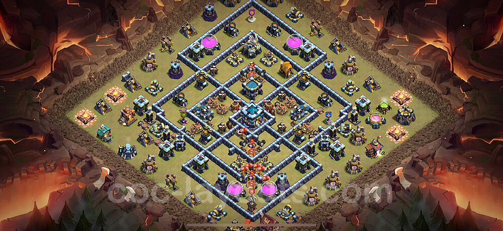 This Town Hall 13 hybrid base offers the best of both worlds - strong resource protection combined with effective trophy defense. The versatile design makes it an excellent choice for players who want to protect their loot while maintaining their trophy count. This balanced approach ensures you don't sacrifice one aspect of defense for another, making it ideal for active players across all league levels. The hybrid layout features centralized resource storages alongside a well-protected Town Hall, with multiple defensive layers that deter both farming raids and trophy pushers. High-value targets are strategically positioned within overlapping defense ranges, forcing attackers to make difficult choices about which objectives to prioritize. The compartmentalized design prevents attackers from easily achieving both loot destruction and the Town Hall kill in a single attack. Defense placement in this hybrid base creates strong coverage against both ground and air attacks. Inferno Towers, X-Bows, and Eagle Artillery work in concert to eliminate threats quickly, while splash damage defenses like Wizard Towers and Bomb Towers counter swarm strategies. The base's funnel-resistant design and strategic trap placement make it effective against popular attack strategies including QC LaLoon (Queen Charge Lava Hound Balloon), Blizzard attacks, and Yeti Smash compositions.