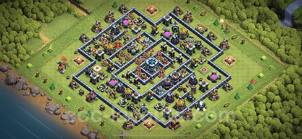 This Town Hall 13 hybrid base offers the best of both worlds - strong resource protection combined with effective trophy defense. The versatile design makes it an excellent choice for players who want to protect their loot while maintaining their trophy count. This balanced approach ensures you don't sacrifice one aspect of defense for another, making it ideal for active players across all league levels. The hybrid layout features centralized resource storages alongside a well-protected Town Hall, with multiple defensive layers that deter both farming raids and trophy pushers. High-value targets are strategically positioned within overlapping defense ranges, forcing attackers to make difficult choices about which objectives to prioritize. The compartmentalized design prevents attackers from easily achieving both loot destruction and the Town Hall kill in a single attack. Defense placement in this hybrid base creates strong coverage against both ground and air attacks. Inferno Towers, X-Bows, and Eagle Artillery work in concert to eliminate threats quickly, while splash damage defenses like Wizard Towers and Bomb Towers counter swarm strategies. The base's funnel-resistant design and strategic trap placement make it effective against popular attack strategies including QC LaLoon (Queen Charge Lava Hound Balloon), Blizzard attacks, and Yeti Smash compositions.