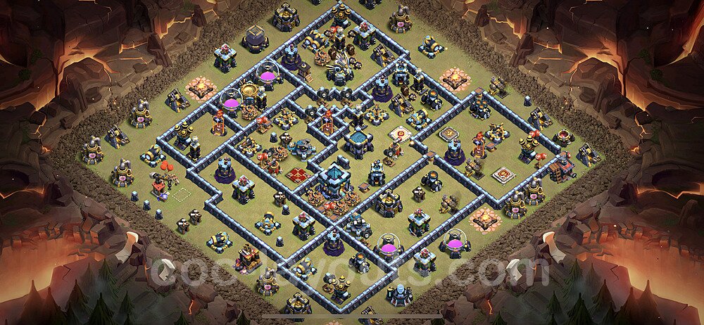 This Town Hall 13 war base is specifically designed to defend against 2-star and 3-star attacks in Clan Wars and Clan War Leagues. The strategic placement of defenses creates multiple compartments that force attackers to use more troops and spells than anticipated. Key defensive structures like Eagle Artillery, Inferno Towers, and X-Bows are positioned to cover crucial sections of the base, making it extremely difficult for opponents to secure a perfect attack. The core of this war base features a centralized Town Hall and Clan Castle, protected by multiple layers of walls and high-damage defenses. This layout forces attackers to commit significant resources just to reach the center, often leaving them without enough firepower to secure the Town Hall destruction. The anti-2-star design ensures that even if attackers breach the outer defenses, they'll struggle to achieve a 50% destruction rating. Air defenses are strategically spread to counter popular air attack strategies like LaLoon (Lava Hound + Balloons) and Electrone (Electro Dragons + Stone Slammer). The symmetrical trap placement and strategic Hidden Tesla positions create deadly surprise elements that can completely derail an attacker's plan. This base has been tested against various meta attack strategies and has consistently proven effective in preventing 3-star attacks.