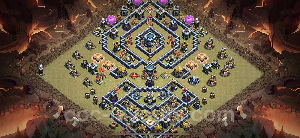 This Town Hall 13 war base is specifically designed to defend against 2-star and 3-star attacks in Clan Wars and Clan War Leagues. The strategic placement of defenses creates multiple compartments that force attackers to use more troops and spells than anticipated. Key defensive structures like Eagle Artillery, Inferno Towers, and X-Bows are positioned to cover crucial sections of the base, making it extremely difficult for opponents to secure a perfect attack. The core of this war base features a centralized Town Hall and Clan Castle, protected by multiple layers of walls and high-damage defenses. This layout forces attackers to commit significant resources just to reach the center, often leaving them without enough firepower to secure the Town Hall destruction. The anti-2-star design ensures that even if attackers breach the outer defenses, they'll struggle to achieve a 50% destruction rating. Air defenses are strategically spread to counter popular air attack strategies like LaLoon (Lava Hound + Balloons) and Electrone (Electro Dragons + Stone Slammer). The symmetrical trap placement and strategic Hidden Tesla positions create deadly surprise elements that can completely derail an attacker's plan. This base has been tested against various meta attack strategies and has consistently proven effective in preventing 3-star attacks.