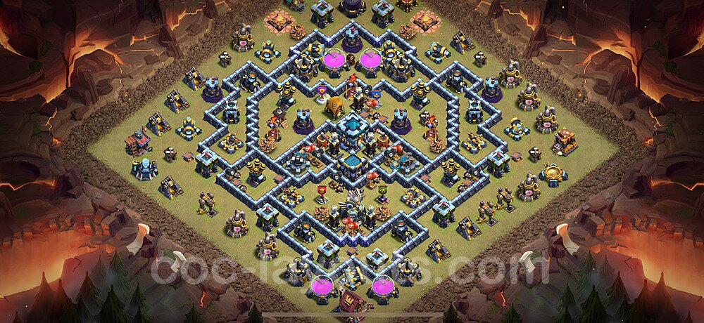 This Town Hall 13 war base is specifically designed to defend against 2-star and 3-star attacks in Clan Wars and Clan War Leagues. The strategic placement of defenses creates multiple compartments that force attackers to use more troops and spells than anticipated. Key defensive structures like Eagle Artillery, Inferno Towers, and X-Bows are positioned to cover crucial sections of the base, making it extremely difficult for opponents to secure a perfect attack. The core of this war base features a centralized Town Hall and Clan Castle, protected by multiple layers of walls and high-damage defenses. This layout forces attackers to commit significant resources just to reach the center, often leaving them without enough firepower to secure the Town Hall destruction. The anti-2-star design ensures that even if attackers breach the outer defenses, they'll struggle to achieve a 50% destruction rating. Air defenses are strategically spread to counter popular air attack strategies like LaLoon (Lava Hound + Balloons) and Electrone (Electro Dragons + Stone Slammer). The symmetrical trap placement and strategic Hidden Tesla positions create deadly surprise elements that can completely derail an attacker's plan. This base has been tested against various meta attack strategies and has consistently proven effective in preventing 3-star attacks.