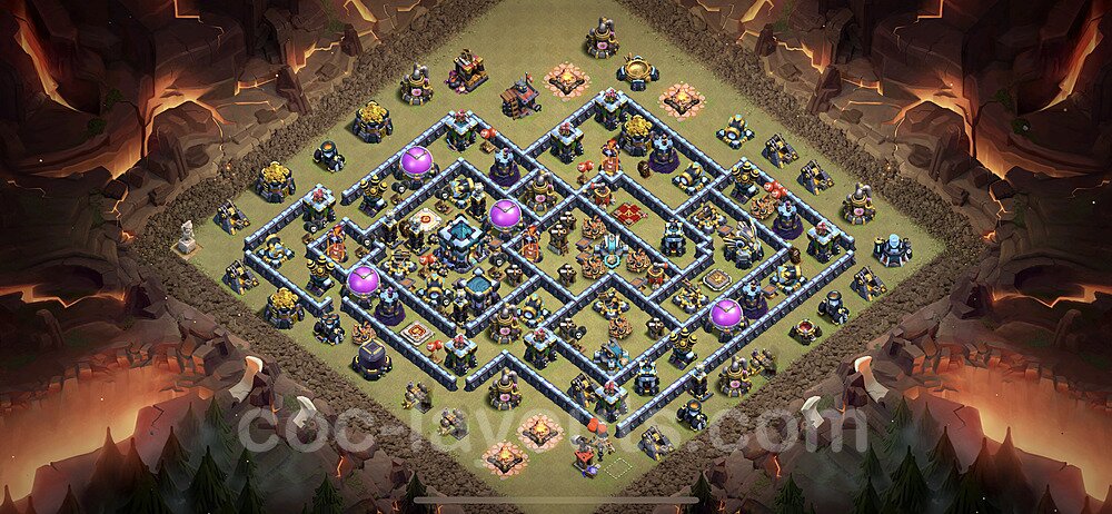 This Town Hall 13 war base is specifically designed to defend against 2-star and 3-star attacks in Clan Wars and Clan War Leagues. The strategic placement of defenses creates multiple compartments that force attackers to use more troops and spells than anticipated. Key defensive structures like Eagle Artillery, Inferno Towers, and X-Bows are positioned to cover crucial sections of the base, making it extremely difficult for opponents to secure a perfect attack. The core of this war base features a centralized Town Hall and Clan Castle, protected by multiple layers of walls and high-damage defenses. This layout forces attackers to commit significant resources just to reach the center, often leaving them without enough firepower to secure the Town Hall destruction. The anti-2-star design ensures that even if attackers breach the outer defenses, they'll struggle to achieve a 50% destruction rating. Air defenses are strategically spread to counter popular air attack strategies like LaLoon (Lava Hound + Balloons) and Electrone (Electro Dragons + Stone Slammer). The symmetrical trap placement and strategic Hidden Tesla positions create deadly surprise elements that can completely derail an attacker's plan. This base has been tested against various meta attack strategies and has consistently proven effective in preventing 3-star attacks.