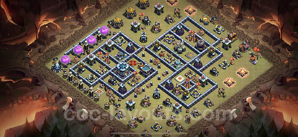 This Town Hall 13 war base is specifically designed to defend against 2-star and 3-star attacks in Clan Wars and Clan War Leagues. The strategic placement of defenses creates multiple compartments that force attackers to use more troops and spells than anticipated. Key defensive structures like Eagle Artillery, Inferno Towers, and X-Bows are positioned to cover crucial sections of the base, making it extremely difficult for opponents to secure a perfect attack. The core of this war base features a centralized Town Hall and Clan Castle, protected by multiple layers of walls and high-damage defenses. This layout forces attackers to commit significant resources just to reach the center, often leaving them without enough firepower to secure the Town Hall destruction. The anti-2-star design ensures that even if attackers breach the outer defenses, they'll struggle to achieve a 50% destruction rating. Air defenses are strategically spread to counter popular air attack strategies like LaLoon (Lava Hound + Balloons) and Electrone (Electro Dragons + Stone Slammer). The symmetrical trap placement and strategic Hidden Tesla positions create deadly surprise elements that can completely derail an attacker's plan. This base has been tested against various meta attack strategies and has consistently proven effective in preventing 3-star attacks.