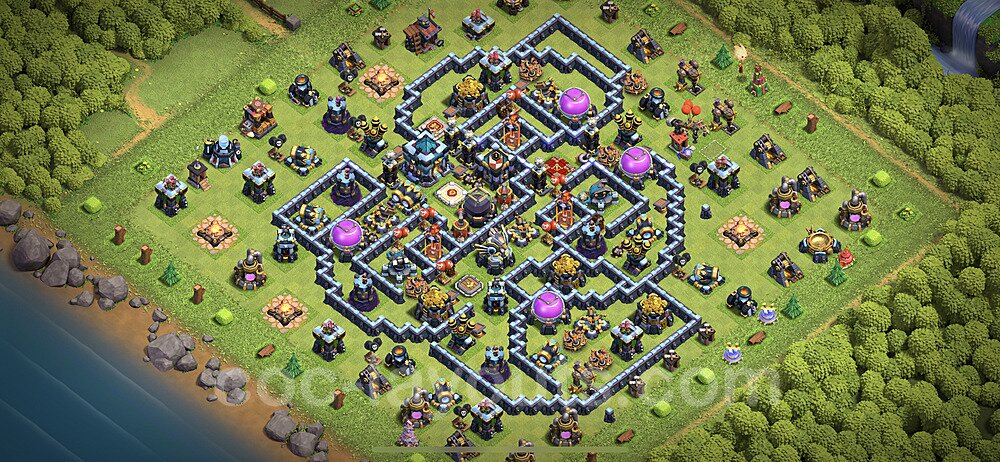This Town Hall 13 farming base is optimized to protect your resources including Gold, Elixir, and Dark Elixir from raiders. The layout features centralized storages with multiple compartments that make it extremely difficult for attackers to steal large amounts of resources in a single raid. This design philosophy prioritizes resource protection over trophies, making it ideal for players focused on upgrading their village. The strategic placement of resource storages ensures they are well-protected by high-damage defenses like X-Bows, Inferno Towers, and Eagle Artillery. Each storage is surrounded by multiple wall layers and defensive structures, forcing attackers to invest heavily in troops and spells to reach your loot. The farming base design also incorporates strategic dead zones where attackers' troops tend to path inefficiently, wasting time and taking heavy damage from nearby defenses. Collectors and mines are positioned on the outer edges as "bait" while your main storages remain heavily protected in the core. This layout has proven effective against common farming strategies like BARCH (Barbarians + Archers), GoWiPe (Golems + Wizards + Pekka), and mass Miner attacks. The compartmentalized design prevents attackers from funneling straight to your resources, ensuring you maintain your hard-earned loot for important upgrades.