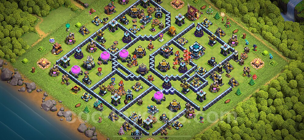 This Town Hall 13 farming base is optimized to protect your resources including Gold, Elixir, and Dark Elixir from raiders. The layout features centralized storages with multiple compartments that make it extremely difficult for attackers to steal large amounts of resources in a single raid. This design philosophy prioritizes resource protection over trophies, making it ideal for players focused on upgrading their village. The strategic placement of resource storages ensures they are well-protected by high-damage defenses like X-Bows, Inferno Towers, and Eagle Artillery. Each storage is surrounded by multiple wall layers and defensive structures, forcing attackers to invest heavily in troops and spells to reach your loot. The farming base design also incorporates strategic dead zones where attackers' troops tend to path inefficiently, wasting time and taking heavy damage from nearby defenses. Collectors and mines are positioned on the outer edges as "bait" while your main storages remain heavily protected in the core. This layout has proven effective against common farming strategies like BARCH (Barbarians + Archers), GoWiPe (Golems + Wizards + Pekka), and mass Miner attacks. The compartmentalized design prevents attackers from funneling straight to your resources, ensuring you maintain your hard-earned loot for important upgrades.