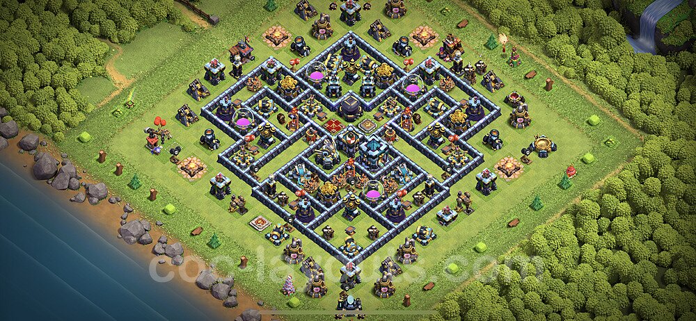 This Town Hall 13 hybrid base offers the best of both worlds - strong resource protection combined with effective trophy defense. The versatile design makes it an excellent choice for players who want to protect their loot while maintaining their trophy count. This balanced approach ensures you don't sacrifice one aspect of defense for another, making it ideal for active players across all league levels. The hybrid layout features centralized resource storages alongside a well-protected Town Hall, with multiple defensive layers that deter both farming raids and trophy pushers. High-value targets are strategically positioned within overlapping defense ranges, forcing attackers to make difficult choices about which objectives to prioritize. The compartmentalized design prevents attackers from easily achieving both loot destruction and the Town Hall kill in a single attack. Defense placement in this hybrid base creates strong coverage against both ground and air attacks. Inferno Towers, X-Bows, and Eagle Artillery work in concert to eliminate threats quickly, while splash damage defenses like Wizard Towers and Bomb Towers counter swarm strategies. The base's funnel-resistant design and strategic trap placement make it effective against popular attack strategies including QC LaLoon (Queen Charge Lava Hound Balloon), Blizzard attacks, and Yeti Smash compositions.