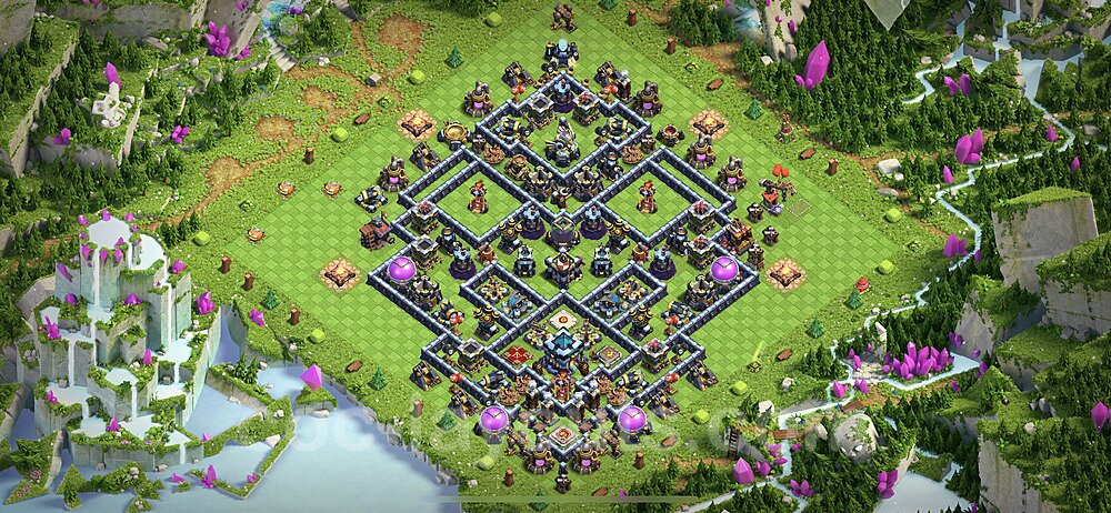 This Town Hall 13 hybrid base offers the best of both worlds - strong resource protection combined with effective trophy defense. The versatile design makes it an excellent choice for players who want to protect their loot while maintaining their trophy count. This balanced approach ensures you don't sacrifice one aspect of defense for another, making it ideal for active players across all league levels. The hybrid layout features centralized resource storages alongside a well-protected Town Hall, with multiple defensive layers that deter both farming raids and trophy pushers. High-value targets are strategically positioned within overlapping defense ranges, forcing attackers to make difficult choices about which objectives to prioritize. The compartmentalized design prevents attackers from easily achieving both loot destruction and the Town Hall kill in a single attack. Defense placement in this hybrid base creates strong coverage against both ground and air attacks. Inferno Towers, X-Bows, and Eagle Artillery work in concert to eliminate threats quickly, while splash damage defenses like Wizard Towers and Bomb Towers counter swarm strategies. The base's funnel-resistant design and strategic trap placement make it effective against popular attack strategies including QC LaLoon (Queen Charge Lava Hound Balloon), Blizzard attacks, and Yeti Smash compositions.