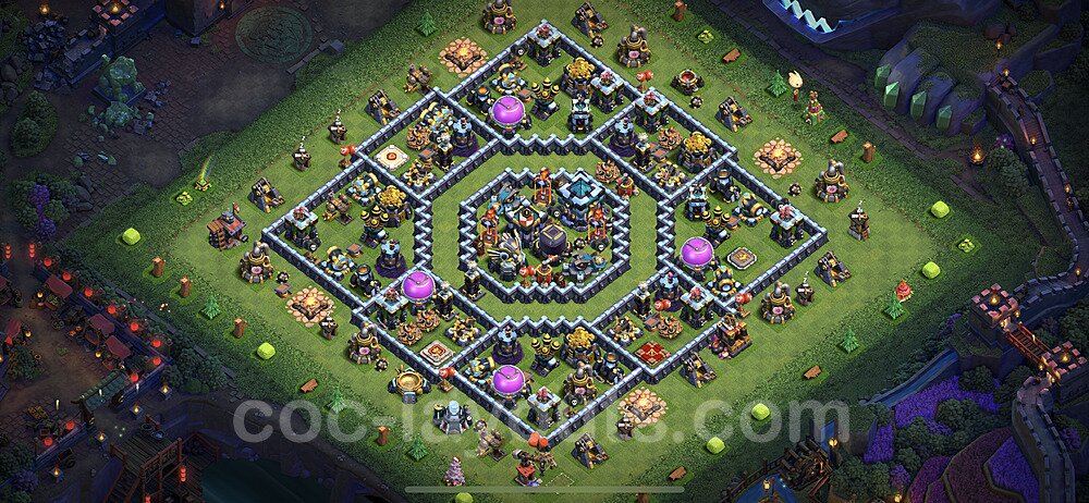This Town Hall 13 hybrid base offers the best of both worlds - strong resource protection combined with effective trophy defense. The versatile design makes it an excellent choice for players who want to protect their loot while maintaining their trophy count. This balanced approach ensures you don't sacrifice one aspect of defense for another, making it ideal for active players across all league levels. The hybrid layout features centralized resource storages alongside a well-protected Town Hall, with multiple defensive layers that deter both farming raids and trophy pushers. High-value targets are strategically positioned within overlapping defense ranges, forcing attackers to make difficult choices about which objectives to prioritize. The compartmentalized design prevents attackers from easily achieving both loot destruction and the Town Hall kill in a single attack. Defense placement in this hybrid base creates strong coverage against both ground and air attacks. Inferno Towers, X-Bows, and Eagle Artillery work in concert to eliminate threats quickly, while splash damage defenses like Wizard Towers and Bomb Towers counter swarm strategies. The base's funnel-resistant design and strategic trap placement make it effective against popular attack strategies including QC LaLoon (Queen Charge Lava Hound Balloon), Blizzard attacks, and Yeti Smash compositions.