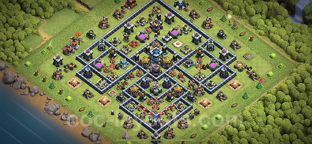 This Town Hall 13 hybrid base offers the best of both worlds - strong resource protection combined with effective trophy defense. The versatile design makes it an excellent choice for players who want to protect their loot while maintaining their trophy count. This balanced approach ensures you don't sacrifice one aspect of defense for another, making it ideal for active players across all league levels. The hybrid layout features centralized resource storages alongside a well-protected Town Hall, with multiple defensive layers that deter both farming raids and trophy pushers. High-value targets are strategically positioned within overlapping defense ranges, forcing attackers to make difficult choices about which objectives to prioritize. The compartmentalized design prevents attackers from easily achieving both loot destruction and the Town Hall kill in a single attack. Defense placement in this hybrid base creates strong coverage against both ground and air attacks. Inferno Towers, X-Bows, and Eagle Artillery work in concert to eliminate threats quickly, while splash damage defenses like Wizard Towers and Bomb Towers counter swarm strategies. The base's funnel-resistant design and strategic trap placement make it effective against popular attack strategies including QC LaLoon (Queen Charge Lava Hound Balloon), Blizzard attacks, and Yeti Smash compositions.