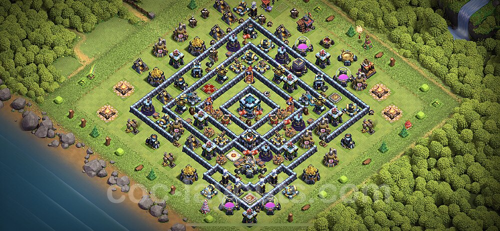 This Town Hall 13 war base is specifically designed to defend against 2-star and 3-star attacks in Clan Wars and Clan War Leagues. The strategic placement of defenses creates multiple compartments that force attackers to use more troops and spells than anticipated. Key defensive structures like Eagle Artillery, Inferno Towers, and X-Bows are positioned to cover crucial sections of the base, making it extremely difficult for opponents to secure a perfect attack. The core of this war base features a centralized Town Hall and Clan Castle, protected by multiple layers of walls and high-damage defenses. This layout forces attackers to commit significant resources just to reach the center, often leaving them without enough firepower to secure the Town Hall destruction. The anti-2-star design ensures that even if attackers breach the outer defenses, they'll struggle to achieve a 50% destruction rating. Air defenses are strategically spread to counter popular air attack strategies like LaLoon (Lava Hound + Balloons) and Electrone (Electro Dragons + Stone Slammer). The symmetrical trap placement and strategic Hidden Tesla positions create deadly surprise elements that can completely derail an attacker's plan. This base has been tested against various meta attack strategies and has consistently proven effective in preventing 3-star attacks.