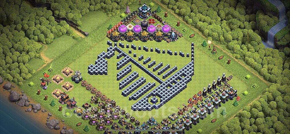 This Town Hall 13 war base is specifically designed to defend against 2-star and 3-star attacks in Clan Wars and Clan War Leagues. The strategic placement of defenses creates multiple compartments that force attackers to use more troops and spells than anticipated. Key defensive structures like Eagle Artillery, Inferno Towers, and X-Bows are positioned to cover crucial sections of the base, making it extremely difficult for opponents to secure a perfect attack. The core of this war base features a centralized Town Hall and Clan Castle, protected by multiple layers of walls and high-damage defenses. This layout forces attackers to commit significant resources just to reach the center, often leaving them without enough firepower to secure the Town Hall destruction. The anti-2-star design ensures that even if attackers breach the outer defenses, they'll struggle to achieve a 50% destruction rating. Air defenses are strategically spread to counter popular air attack strategies like LaLoon (Lava Hound + Balloons) and Electrone (Electro Dragons + Stone Slammer). The symmetrical trap placement and strategic Hidden Tesla positions create deadly surprise elements that can completely derail an attacker's plan. This base has been tested against various meta attack strategies and has consistently proven effective in preventing 3-star attacks.
