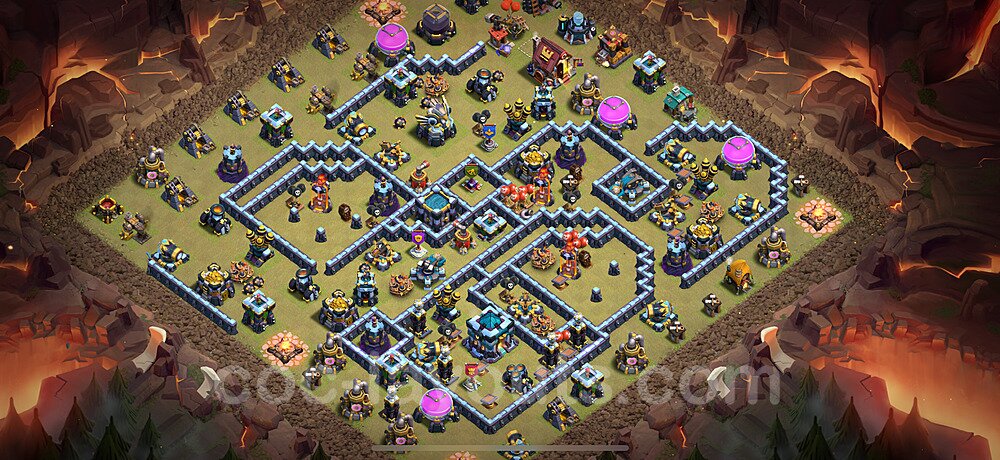 This Town Hall 13 war base is specifically designed to defend against 2-star and 3-star attacks in Clan Wars and Clan War Leagues. The strategic placement of defenses creates multiple compartments that force attackers to use more troops and spells than anticipated. Key defensive structures like Eagle Artillery, Inferno Towers, and X-Bows are positioned to cover crucial sections of the base, making it extremely difficult for opponents to secure a perfect attack. The core of this war base features a centralized Town Hall and Clan Castle, protected by multiple layers of walls and high-damage defenses. This layout forces attackers to commit significant resources just to reach the center, often leaving them without enough firepower to secure the Town Hall destruction. The anti-2-star design ensures that even if attackers breach the outer defenses, they'll struggle to achieve a 50% destruction rating. Air defenses are strategically spread to counter popular air attack strategies like LaLoon (Lava Hound + Balloons) and Electrone (Electro Dragons + Stone Slammer). The symmetrical trap placement and strategic Hidden Tesla positions create deadly surprise elements that can completely derail an attacker's plan. This base has been tested against various meta attack strategies and has consistently proven effective in preventing 3-star attacks.