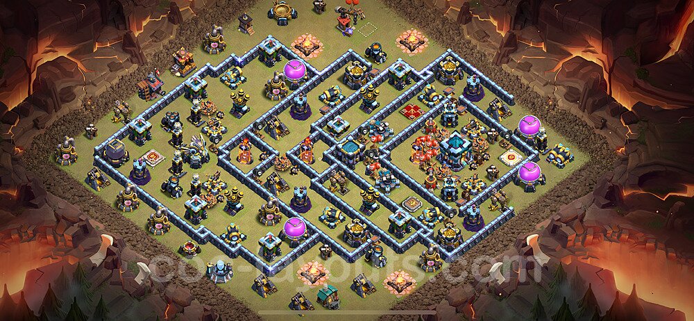 This Town Hall 13 war base is specifically designed to defend against 2-star and 3-star attacks in Clan Wars and Clan War Leagues. The strategic placement of defenses creates multiple compartments that force attackers to use more troops and spells than anticipated. Key defensive structures like Eagle Artillery, Inferno Towers, and X-Bows are positioned to cover crucial sections of the base, making it extremely difficult for opponents to secure a perfect attack. The core of this war base features a centralized Town Hall and Clan Castle, protected by multiple layers of walls and high-damage defenses. This layout forces attackers to commit significant resources just to reach the center, often leaving them without enough firepower to secure the Town Hall destruction. The anti-2-star design ensures that even if attackers breach the outer defenses, they'll struggle to achieve a 50% destruction rating. Air defenses are strategically spread to counter popular air attack strategies like LaLoon (Lava Hound + Balloons) and Electrone (Electro Dragons + Stone Slammer). The symmetrical trap placement and strategic Hidden Tesla positions create deadly surprise elements that can completely derail an attacker's plan. This base has been tested against various meta attack strategies and has consistently proven effective in preventing 3-star attacks.