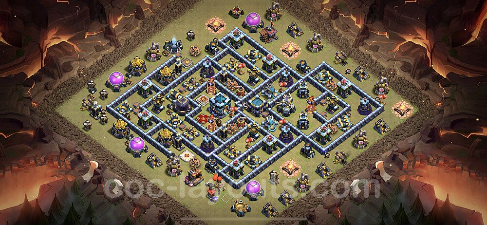 This Town Hall 13 war base is specifically designed to defend against 2-star and 3-star attacks in Clan Wars and Clan War Leagues. The strategic placement of defenses creates multiple compartments that force attackers to use more troops and spells than anticipated. Key defensive structures like Eagle Artillery, Inferno Towers, and X-Bows are positioned to cover crucial sections of the base, making it extremely difficult for opponents to secure a perfect attack. The core of this war base features a centralized Town Hall and Clan Castle, protected by multiple layers of walls and high-damage defenses. This layout forces attackers to commit significant resources just to reach the center, often leaving them without enough firepower to secure the Town Hall destruction. The anti-2-star design ensures that even if attackers breach the outer defenses, they'll struggle to achieve a 50% destruction rating. Air defenses are strategically spread to counter popular air attack strategies like LaLoon (Lava Hound + Balloons) and Electrone (Electro Dragons + Stone Slammer). The symmetrical trap placement and strategic Hidden Tesla positions create deadly surprise elements that can completely derail an attacker's plan. This base has been tested against various meta attack strategies and has consistently proven effective in preventing 3-star attacks.