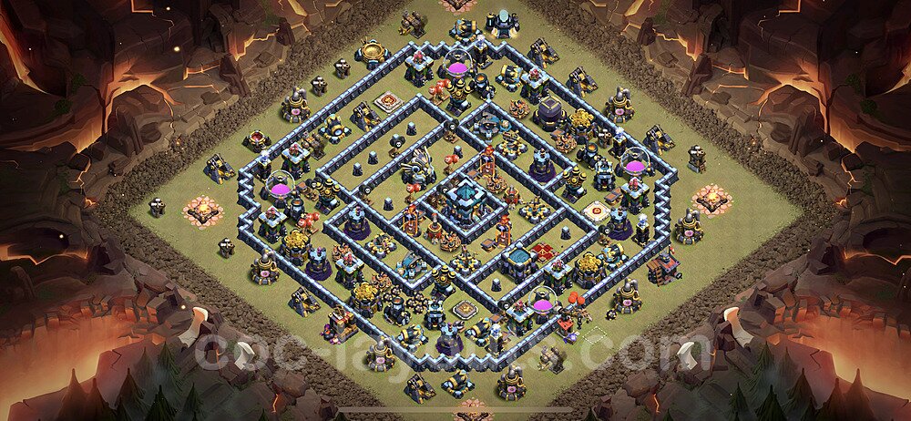 This Town Hall 13 war base is specifically designed to defend against 2-star and 3-star attacks in Clan Wars and Clan War Leagues. The strategic placement of defenses creates multiple compartments that force attackers to use more troops and spells than anticipated. Key defensive structures like Eagle Artillery, Inferno Towers, and X-Bows are positioned to cover crucial sections of the base, making it extremely difficult for opponents to secure a perfect attack. The core of this war base features a centralized Town Hall and Clan Castle, protected by multiple layers of walls and high-damage defenses. This layout forces attackers to commit significant resources just to reach the center, often leaving them without enough firepower to secure the Town Hall destruction. The anti-2-star design ensures that even if attackers breach the outer defenses, they'll struggle to achieve a 50% destruction rating. Air defenses are strategically spread to counter popular air attack strategies like LaLoon (Lava Hound + Balloons) and Electrone (Electro Dragons + Stone Slammer). The symmetrical trap placement and strategic Hidden Tesla positions create deadly surprise elements that can completely derail an attacker's plan. This base has been tested against various meta attack strategies and has consistently proven effective in preventing 3-star attacks.