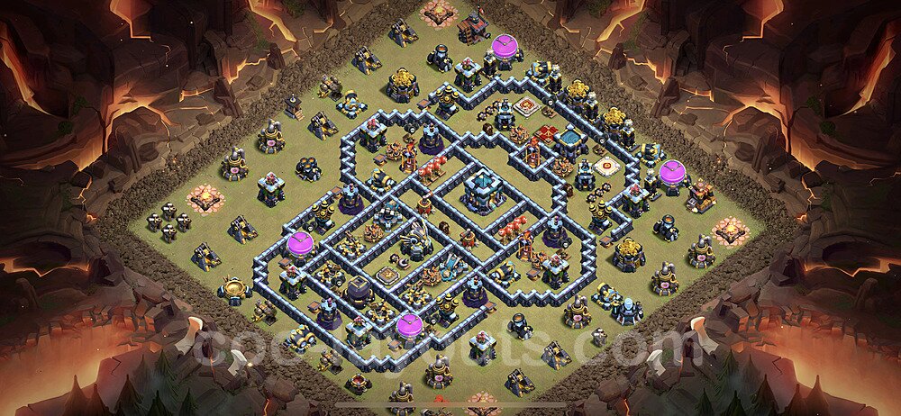 This Town Hall 13 war base is specifically designed to defend against 2-star and 3-star attacks in Clan Wars and Clan War Leagues. The strategic placement of defenses creates multiple compartments that force attackers to use more troops and spells than anticipated. Key defensive structures like Eagle Artillery, Inferno Towers, and X-Bows are positioned to cover crucial sections of the base, making it extremely difficult for opponents to secure a perfect attack. The core of this war base features a centralized Town Hall and Clan Castle, protected by multiple layers of walls and high-damage defenses. This layout forces attackers to commit significant resources just to reach the center, often leaving them without enough firepower to secure the Town Hall destruction. The anti-2-star design ensures that even if attackers breach the outer defenses, they'll struggle to achieve a 50% destruction rating. Air defenses are strategically spread to counter popular air attack strategies like LaLoon (Lava Hound + Balloons) and Electrone (Electro Dragons + Stone Slammer). The symmetrical trap placement and strategic Hidden Tesla positions create deadly surprise elements that can completely derail an attacker's plan. This base has been tested against various meta attack strategies and has consistently proven effective in preventing 3-star attacks.