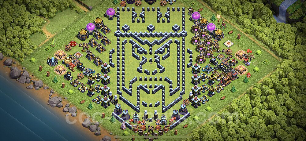 This Town Hall 13 war base is specifically designed to defend against 2-star and 3-star attacks in Clan Wars and Clan War Leagues. The strategic placement of defenses creates multiple compartments that force attackers to use more troops and spells than anticipated. Key defensive structures like Eagle Artillery, Inferno Towers, and X-Bows are positioned to cover crucial sections of the base, making it extremely difficult for opponents to secure a perfect attack. The core of this war base features a centralized Town Hall and Clan Castle, protected by multiple layers of walls and high-damage defenses. This layout forces attackers to commit significant resources just to reach the center, often leaving them without enough firepower to secure the Town Hall destruction. The anti-2-star design ensures that even if attackers breach the outer defenses, they'll struggle to achieve a 50% destruction rating. Air defenses are strategically spread to counter popular air attack strategies like LaLoon (Lava Hound + Balloons) and Electrone (Electro Dragons + Stone Slammer). The symmetrical trap placement and strategic Hidden Tesla positions create deadly surprise elements that can completely derail an attacker's plan. This base has been tested against various meta attack strategies and has consistently proven effective in preventing 3-star attacks.
