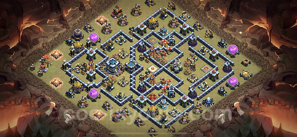 This Town Hall 13 war base is specifically designed to defend against 2-star and 3-star attacks in Clan Wars and Clan War Leagues. The strategic placement of defenses creates multiple compartments that force attackers to use more troops and spells than anticipated. Key defensive structures like Eagle Artillery, Inferno Towers, and X-Bows are positioned to cover crucial sections of the base, making it extremely difficult for opponents to secure a perfect attack. The core of this war base features a centralized Town Hall and Clan Castle, protected by multiple layers of walls and high-damage defenses. This layout forces attackers to commit significant resources just to reach the center, often leaving them without enough firepower to secure the Town Hall destruction. The anti-2-star design ensures that even if attackers breach the outer defenses, they'll struggle to achieve a 50% destruction rating. Air defenses are strategically spread to counter popular air attack strategies like LaLoon (Lava Hound + Balloons) and Electrone (Electro Dragons + Stone Slammer). The symmetrical trap placement and strategic Hidden Tesla positions create deadly surprise elements that can completely derail an attacker's plan. This base has been tested against various meta attack strategies and has consistently proven effective in preventing 3-star attacks.