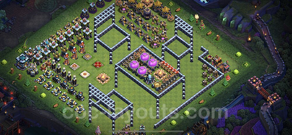 This Town Hall 13 war base is specifically designed to defend against 2-star and 3-star attacks in Clan Wars and Clan War Leagues. The strategic placement of defenses creates multiple compartments that force attackers to use more troops and spells than anticipated. Key defensive structures like Eagle Artillery, Inferno Towers, and X-Bows are positioned to cover crucial sections of the base, making it extremely difficult for opponents to secure a perfect attack. The core of this war base features a centralized Town Hall and Clan Castle, protected by multiple layers of walls and high-damage defenses. This layout forces attackers to commit significant resources just to reach the center, often leaving them without enough firepower to secure the Town Hall destruction. The anti-2-star design ensures that even if attackers breach the outer defenses, they'll struggle to achieve a 50% destruction rating. Air defenses are strategically spread to counter popular air attack strategies like LaLoon (Lava Hound + Balloons) and Electrone (Electro Dragons + Stone Slammer). The symmetrical trap placement and strategic Hidden Tesla positions create deadly surprise elements that can completely derail an attacker's plan. This base has been tested against various meta attack strategies and has consistently proven effective in preventing 3-star attacks.