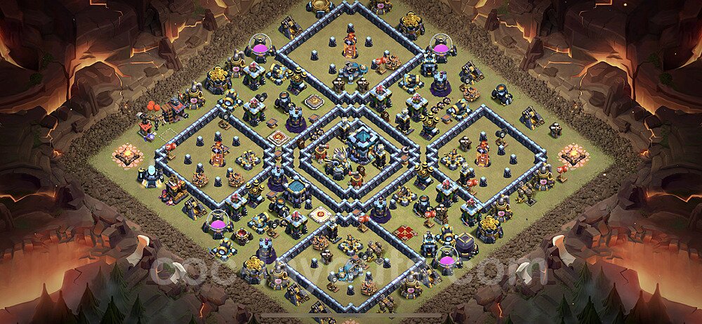 This Town Hall 13 war base is specifically designed to defend against 2-star and 3-star attacks in Clan Wars and Clan War Leagues. The strategic placement of defenses creates multiple compartments that force attackers to use more troops and spells than anticipated. Key defensive structures like Eagle Artillery, Inferno Towers, and X-Bows are positioned to cover crucial sections of the base, making it extremely difficult for opponents to secure a perfect attack. The core of this war base features a centralized Town Hall and Clan Castle, protected by multiple layers of walls and high-damage defenses. This layout forces attackers to commit significant resources just to reach the center, often leaving them without enough firepower to secure the Town Hall destruction. The anti-2-star design ensures that even if attackers breach the outer defenses, they'll struggle to achieve a 50% destruction rating. Air defenses are strategically spread to counter popular air attack strategies like LaLoon (Lava Hound + Balloons) and Electrone (Electro Dragons + Stone Slammer). The symmetrical trap placement and strategic Hidden Tesla positions create deadly surprise elements that can completely derail an attacker's plan. This base has been tested against various meta attack strategies and has consistently proven effective in preventing 3-star attacks.