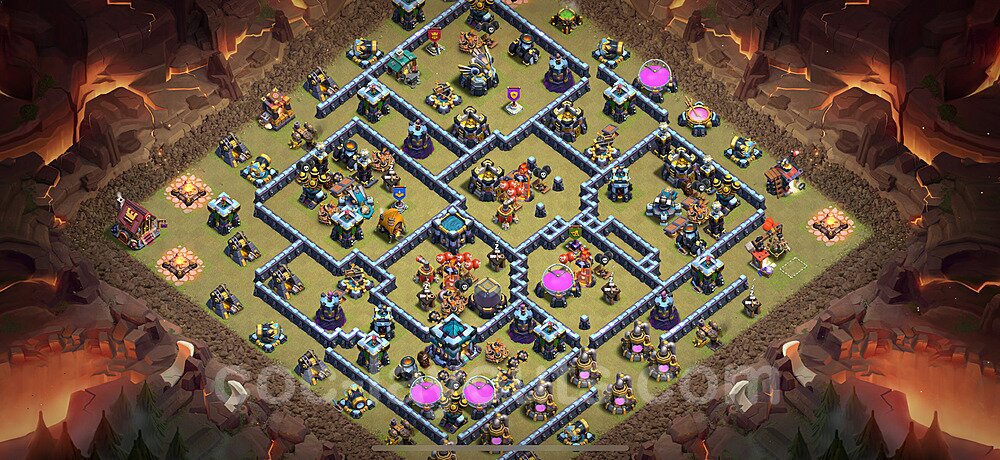 This Town Hall 13 war base is specifically designed to defend against 2-star and 3-star attacks in Clan Wars and Clan War Leagues. The strategic placement of defenses creates multiple compartments that force attackers to use more troops and spells than anticipated. Key defensive structures like Eagle Artillery, Inferno Towers, and X-Bows are positioned to cover crucial sections of the base, making it extremely difficult for opponents to secure a perfect attack. The core of this war base features a centralized Town Hall and Clan Castle, protected by multiple layers of walls and high-damage defenses. This layout forces attackers to commit significant resources just to reach the center, often leaving them without enough firepower to secure the Town Hall destruction. The anti-2-star design ensures that even if attackers breach the outer defenses, they'll struggle to achieve a 50% destruction rating. Air defenses are strategically spread to counter popular air attack strategies like LaLoon (Lava Hound + Balloons) and Electrone (Electro Dragons + Stone Slammer). The symmetrical trap placement and strategic Hidden Tesla positions create deadly surprise elements that can completely derail an attacker's plan. This base has been tested against various meta attack strategies and has consistently proven effective in preventing 3-star attacks.