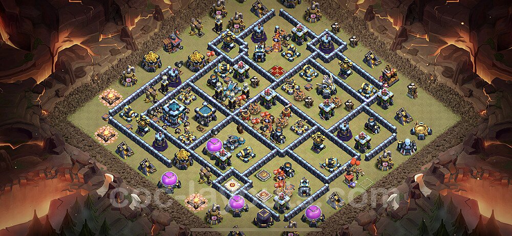 This Town Hall 13 war base is specifically designed to defend against 2-star and 3-star attacks in Clan Wars and Clan War Leagues. The strategic placement of defenses creates multiple compartments that force attackers to use more troops and spells than anticipated. Key defensive structures like Eagle Artillery, Inferno Towers, and X-Bows are positioned to cover crucial sections of the base, making it extremely difficult for opponents to secure a perfect attack. The core of this war base features a centralized Town Hall and Clan Castle, protected by multiple layers of walls and high-damage defenses. This layout forces attackers to commit significant resources just to reach the center, often leaving them without enough firepower to secure the Town Hall destruction. The anti-2-star design ensures that even if attackers breach the outer defenses, they'll struggle to achieve a 50% destruction rating. Air defenses are strategically spread to counter popular air attack strategies like LaLoon (Lava Hound + Balloons) and Electrone (Electro Dragons + Stone Slammer). The symmetrical trap placement and strategic Hidden Tesla positions create deadly surprise elements that can completely derail an attacker's plan. This base has been tested against various meta attack strategies and has consistently proven effective in preventing 3-star attacks.