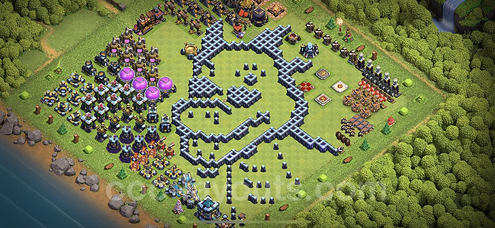 This Town Hall 13 war base is specifically designed to defend against 2-star and 3-star attacks in Clan Wars and Clan War Leagues. The strategic placement of defenses creates multiple compartments that force attackers to use more troops and spells than anticipated. Key defensive structures like Eagle Artillery, Inferno Towers, and X-Bows are positioned to cover crucial sections of the base, making it extremely difficult for opponents to secure a perfect attack. The core of this war base features a centralized Town Hall and Clan Castle, protected by multiple layers of walls and high-damage defenses. This layout forces attackers to commit significant resources just to reach the center, often leaving them without enough firepower to secure the Town Hall destruction. The anti-2-star design ensures that even if attackers breach the outer defenses, they'll struggle to achieve a 50% destruction rating. Air defenses are strategically spread to counter popular air attack strategies like LaLoon (Lava Hound + Balloons) and Electrone (Electro Dragons + Stone Slammer). The symmetrical trap placement and strategic Hidden Tesla positions create deadly surprise elements that can completely derail an attacker's plan. This base has been tested against various meta attack strategies and has consistently proven effective in preventing 3-star attacks.