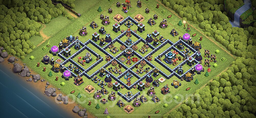 This Town Hall 13 war base is specifically designed to defend against 2-star and 3-star attacks in Clan Wars and Clan War Leagues. The strategic placement of defenses creates multiple compartments that force attackers to use more troops and spells than anticipated. Key defensive structures like Eagle Artillery, Inferno Towers, and X-Bows are positioned to cover crucial sections of the base, making it extremely difficult for opponents to secure a perfect attack. The core of this war base features a centralized Town Hall and Clan Castle, protected by multiple layers of walls and high-damage defenses. This layout forces attackers to commit significant resources just to reach the center, often leaving them without enough firepower to secure the Town Hall destruction. The anti-2-star design ensures that even if attackers breach the outer defenses, they'll struggle to achieve a 50% destruction rating. Air defenses are strategically spread to counter popular air attack strategies like LaLoon (Lava Hound + Balloons) and Electrone (Electro Dragons + Stone Slammer). The symmetrical trap placement and strategic Hidden Tesla positions create deadly surprise elements that can completely derail an attacker's plan. This base has been tested against various meta attack strategies and has consistently proven effective in preventing 3-star attacks.